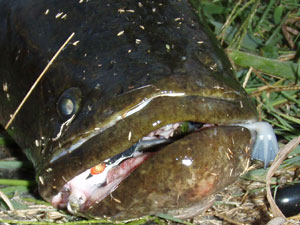 4時半起床。寝ている丸氏をたたき起こし、ゲルググさんと合流し、3人で一発狙いの三振池にGO!ちなみに丸氏は初心者wで、開始15分。作ったばかりのスミス足ライトスをヒシのすきま叩き込むと、ボフ!と雷魚捕食!思いっきりあわすと、雷魚が垂直とびwそのまま大暴れ。尻尾が小さかったので、70くらいか・・・と思ってそのままランディングしようとすると「頭デカッ!」どうみても80クラスの風格がただよう頭です!と、その瞬間思い出したように大暴れ。ここでバラしたら、泣くに泣けん!と頑張ってランディング!サイズは・・・・・・