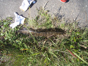しばらく考えた後、クリークへ入ることに。靴を脱ぎ、ジーパンめくってレッツゴー♪底が泥だから沈む沈む。あっという間に太ももまで浸かってしまい、ジーパンはビショビショ。エラブタをつかもうとすると、お約束の最後のひと暴れで上半身もビショビショ。