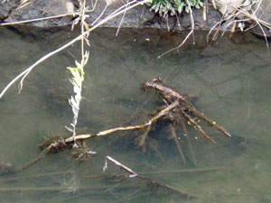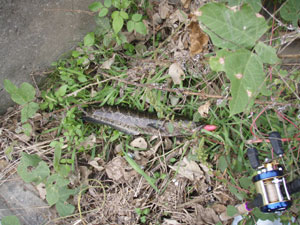 クリークが減水しているため、手は届かない。そのまま引っこ抜くと、間違いなく皮が切れてバレ。