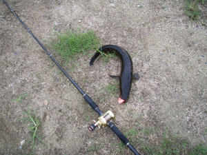 凄まじい音を立てて、アバニGT8号がラインブレイク。まだシバに絡まっていたので池に入って行き、手繰り寄せるも、ラインの根元が見つからない。シバをまさぐっていると、シバに絡んでいるヒシの実が手に突き刺さり、穴だらけに。激痛が走ります。半ズボンが完全に浸水し、もともと悪い水なので、すごいニオイです(涙)
