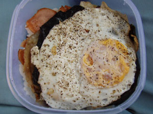 ご飯を乗せ、卵焼きを乗せ、防腐剤の代わりに梅干を入れて完成。