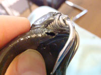 がしかし、フロッグを見てみると、フックの先がアホになっちゅう。ハネクラのトライアングルポイント、高いわりにボロいです。偏芯フックポイントやのーて、重心フックポイントにしてくれたら、史上最強の針になるんやけどな〜。形状は文句なしなんだけど、フックポイントをなんとかしてくれんかな〜。