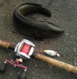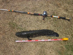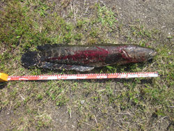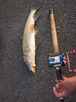 すると、雷魚発見!つっても60cmくらいのマメ君ですが。