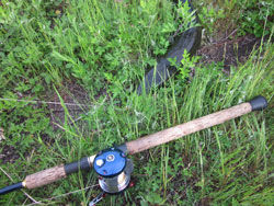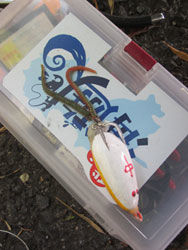 話してみると、なかなかにコアな雷魚マンで、リールはオールドアブ。それも60年代のレコード。こんだけ古いアブ見るのは初めてなんで、色々話しているうちにフロッグの見せ合いっこ。なんと懐かしのポンが大集合ですわwさらに、偶然にもフクスケフロッグ知らない人だったので、僕のフロッグケース見せたら、かなり盛り上がりましたw