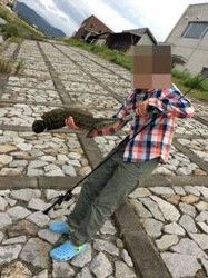そんで、結局最初の池へUターン。あ〜〜〜滅入る〜〜〜なんて、夕マズメの凪を待ちつつ、ウロウロしてたら、なんとめずらしか!雷魚マン登場ですわ!
