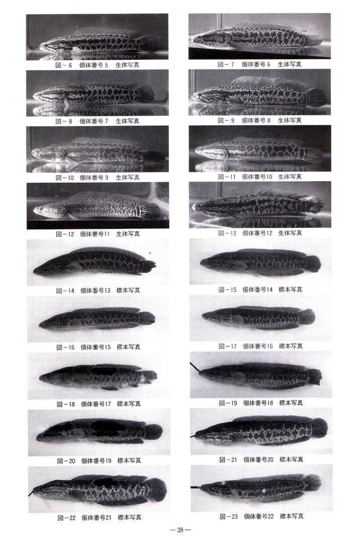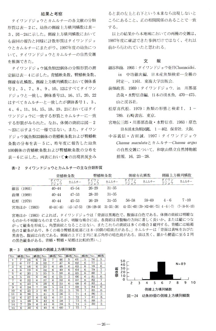 これが捕獲した稚魚89匹の形質データ。稚魚については、側線上方横列ウロコ数を比較していますが、松原(1979)によると、側線上方横列ウロコ数は、ライヒーが4-6枚。カムルチーが7-10枚なのですが、稚魚に関してサンプルの写真を掲載しておらず、また、今回のサンプルのカムルチーとライヒーのウロコ数の比較グラフもないので、意味がないと思いました。
