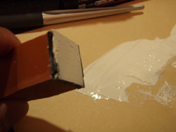 で、彫られていないゴム印を使って伸ばします。ネバすぎてなかなか伸びませんwゴムならば何でもOKです。で、うすーくゴム印に塗料を乗っけて