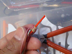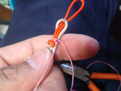 まずは、約10cmくらい切ります。通常、アシストフックで使うもので、新糸を抜いて使うものですが、フニャフニャになるので、それはやりません。