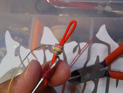 続いてPEでクリンチノットでコブの手前を縛り、グルグル巻きにして、