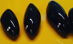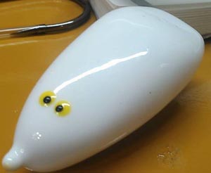 カタが各1個しかないんで、たとえば、フクロウ5個、ピンク、緑、黒、白、銀ラメとかだと、「電気炉で温めて成形して、離型して、再び温めて」を5回行う必要があり、非常に効率が悪いです。成形前に瓶を撹拌しなきゃいけないので、多色単品種というのは、もっとも効率が悪い注文です。