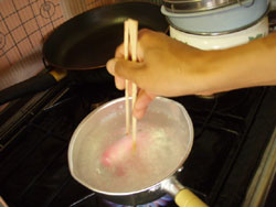 沸騰水をオケに入れて、箸でつまんでモミモミ。箸で取り出して手でモミモミ。これでいけます。釜ゆでみたいに、ゆですぎてネチャネチャになることもないし、やらこさもセッティングしやすいし、こっちのやり方のほうが優れています。
