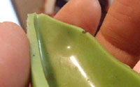 オイルバスで加熱。熱は大体180〜200度くらいと思われる。樹脂を隅々までいきわたらせるために、コロコロと転がしながら湯がく。湯煎されるので、金型は均一な温度で加熱される。この時、熱硬化型樹脂が硬化するだけの温度に達したら、温度の高い、外側から樹脂が固まり始める。図で言うと、水色の部分が固まった樹脂です。紫の樹脂はまだ固まってないので液体です。ちなみに、ここではオイルバスと書いていますが、金型を均一に加熱出来ればよいので、蒸気ガマで加熱でもいいと思います。直火は火元の温度が高く、場所によって、温度にバラツキが出るため、無理だと思います。ちなみに、一気に何十個も作るので、取り出す時間にタイムラグが出来ます。遅く取り出したものは、長い間加熱されることになるので、樹脂が厚く、一方、早めに取り出されたものは、樹脂が薄く、また、オイルバスといっても、熱源は下なので、下のほうが温度が高く、そうすると、樹脂が早く固まるので、熱源に近い部分は樹脂が厚くなります。フロッグの皮が不均一でバラツキが多いというのは、これが原因と思います。