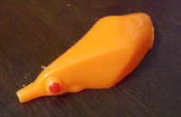 そして、蒸気炉から金型を取り出し、フックホールから樹脂を引っ張って、取り出す。バリを切って、完成。こうして、継ぎ目のないフロッグが出来るわけです。