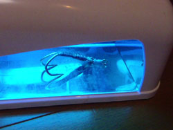 一方、UVレジンは紫外線が硬化剤の役割をする接着剤で、2液と同等の強度性能を誇ります。そして、東邦UVレジンは粘性が低いのが特徴で、結果、シャープに接着することが出来、シーリング時に邪魔にならないと、こーゆーことなのです。これは「2液接着剤の応用再び」で紹介した画像ですが、シャープにきれいに接着できているでしょ?また、もう一つの魅力は鬼の作業性を誇るということ。UVレジンはUV照射機を使うと、5秒で仮止めできます。完全硬化は15分照射が必要です(照射時間が短いと表面がベタつく)が、フロッグチューニングでは、ウェイトの仮止めが出来ると、2段目3段目のコイルウェイト追加がサクサクできますから、まさにうってつけの接着剤なのです。このUV照射機はネイル用の照射機で、高松の天満屋ロフトで1万円ほどでした。嫁さんのネイルのために買ったものですが、今では横取りしてフロッグチューニングツールの一角を担っています(汗)