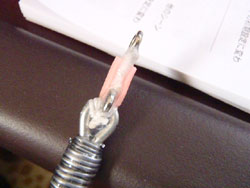 良い感じだったので、この組み合わせで正式決定です。で、次はアイのスレッド巻き作業です。通常、ステンアイはステンがツルツルしている上に、ステンが難接着物質だったりする(ペンキがのらない)ので、軟質塩ビのフロッグとも相性が悪く、アイがずれるトラブルがおきやすくなります。
