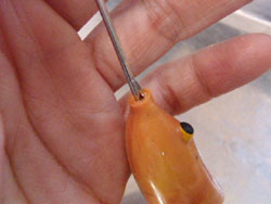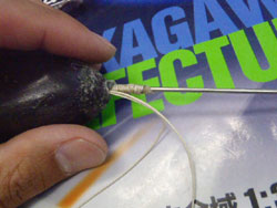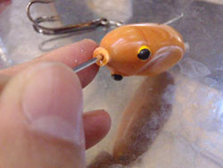 フロッグの口に突き刺さることがしょっちゅうあって、また、実際のフロッグチューニングでは、ウェイト調整で何度も骨組みを出し入れするので、手間がかかるし、最悪の方法です。