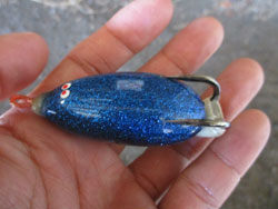 そこはフクスケフロッグの特徴で、ボディに対してデカイ針使っているのと、ゲイブのかなり後方にシンカーを入れてチューニングしているので、後方重心が極限まで生きていて、結構飛ぶんで、大丈夫^^