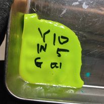 すると、ギリ発色しましたが、色合いが暗く、個人的には60点。これでもよければ、作りますと告知したところ、結構注文があったので、黄色スイカ用のトナーを別途作ることにして、配合はゾル100:可塑剤5g、トナーFT468単色2g配合で決定!