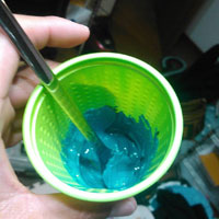 なので、ターコイズブルーは白:10、青2、緑1で決定!ただ、実際やるときは、緑は0.1とか、0.5gとかで調整します。この際、ハカリがブレて、一気に配合がどす黒くシフトするんで、緑はほんの少し入れながら色合いを確認しつつ、アタリを出していったほうがいいと思います。