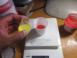配合はおおむね4%。ゾル1000gに対して油絵具40g。