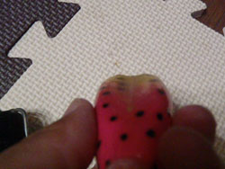スイカはねちゃつき皆無。つまり赤と緑はネチャがない。蛍光オレンジ(色止めホワイトなし)はややネチャツキがあるんですが、ハナクソ程度で影響なし。黒はめっちゃネチャついています。白も同様。いったいどういうことなのか、市販ラッカーとかは劣化でネチャつきが起きたりするんですが、ナガシマのもそうなのかしら?しかし、ソフビカラーなんて需要がないペンキなんてどこの店も長年売れ残りばかりだとおもうんだけど、どうなんやろ?