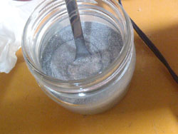 というわけで、青ラメを配合していくわけですが、ラメ同士の隙間に気泡がはいって、こいつがしつこくでてくるのと、混ぜるときに力がいるんで、結構重労働です。