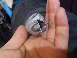 しかし、課題その一で、皮を裏返してみると硬化が甘くて、カブっている部分がありました。ラメが後乾燥の熱の伝導を阻害している感じです。やるなら、一発目の透明ゾルを成形した後に、いったん後乾燥をかけて仕上げた状態で二重ディップに持ち込んだほうがよさそうです。あと、そのほうが放熱したカタに再び熱が加わるんで、ラメゾルの食いつきがよくなるはずです。それと、皮自体が硬すぎ。結構な硬さ&厚さですわ。