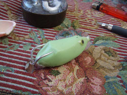 んで、また金型を変えてチャレンジ。これはなかなかの出来栄えwwwしかし、ケツのほうが薄すぎる。樹脂の厚み誤差もひどい。中空フロッグはこの樹脂の厚みが不均一だとホントにダメです。んで、もう一つのトラブルにようやく気づいた感があります。そのトラブルのリカバリをしようとすると、せっかく良い感じだった皮が一発アウト。こりゃ使いモンになりませぬ。