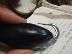 日本製のフロッグだったら、例えば、アマガエルだと、17g垂直浮きとかであらかじめデータを出しておけば、次に同じフロッグをチューニングするときなんかの浮き姿勢の目安になります。ボディの成形誤差が少ないので、何個作ったって、おおかた、17gでほぼピッタリの姿勢を再現できます。