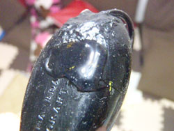 こいつは固まった後です。通常、溶剤系シーラーは固まると白くなってカチカチになるんですが、こいつはあめ色で、ブニブニです。