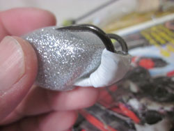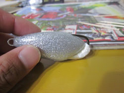 この時点で15.1g。いい感じです。通常なら、アイとシャンクを収縮チューブで固定しますが、ツバメの場合、無理して針を眠らさなくても、針先が隠れてくれるんでお好みで。今回は収縮チューブなしで行けます。
