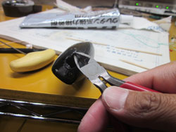 この時便利なのが、瞬接の硬化剤です。通常、シャンクの矯正で瞬接を使うときは、硬化が遅いとワイヤーの弾力で戻ってしまい、矯正ができないことが多いのですが、硬化剤を使うと一瞬で硬化してくれるので、矯正では非常に便利です。ただ、匂いがきついので、窓側で、扇風機回しながらやるといいです。