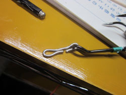 フィッティングさせながら、針先が隠れるように、フックホールをジワジワと広げつつ、また合わせてという微調整を繰り返します。