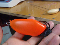 まずは皮ですが、最近研究中の外壁塗装で蛍光オレンジに塗った皮を使います。内壁塗装と違って表面がパサパサしてフロッグぽくないです。個人的には内壁塗装のほうが好みなんやけどね〜〜〜