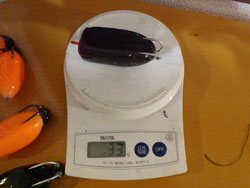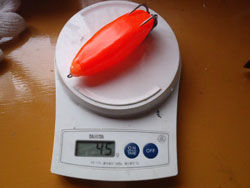18g垂直浮き。3段目と同じような長細く、薄いフロッグで、手もみした限り、3段目のほうが凹んだときの針の露出がよく、3段目の出動が多かったため、結局一度も出番なし。ダメこれ。