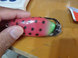 この時期、フロッグ上部にパンドーを塗り、雷魚の口をスライドした時のすべりを良くするチューニングを施していましたが、マテリアルがパンドーと相性が悪いので、剥離しています。