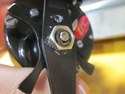 その後、ドラグを外します。左ハンドルなので、逆ネジなので、時計回りに回すと外れます。