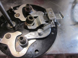 裏側では、シャフトが出ており、そこにクラッチのアームの先が引っかかっています。