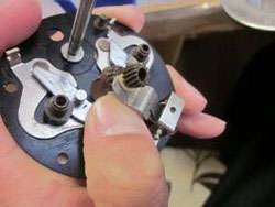 ピニオンを入れ、続いてアームのスプリングをセットします。