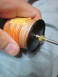 そしてスプールを取り出します。この際、ラインがバラけないようにマスキングテープで止めておきます。