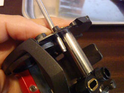 この状態で、左手でリフトカーブを抑え、右手でペンチをつまんで、フレームにスプリングの外れているほうをセットします。
