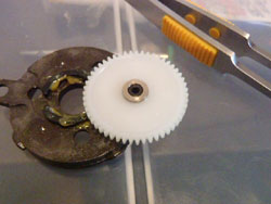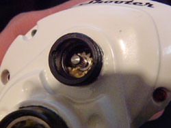 で、ベアリングはずしたら、ピニオンギアが見えました。