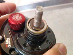 このようにセットして、フレームにネジ止めします。なお、この時点で、レベルワインドのネジがウォームギアが重くないかチェックしてください。OHが間違っていると、この時、レベルワインドが重くなります。