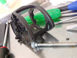 サテ、そんなわけで、ドラグの分解に入ります。まずは金属プレートを外します。コレ、向きがあって、凸がハンドル側に来るようになっています。