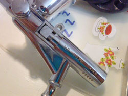 すでに塗ったところはグリスが落ちていて、ボディはグリスまみれ。このリチウムグリス、やりこくて、手に付いたらそのままあっちこっちに付きまくるので、ボディがグリスまみれになり、一番付けたいローラー部は一瞬で落ちてしまうとです。吹いた後は手はグリスでヌルヌル。これだけグリスが落ちると、ハジキも心配です。
