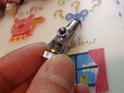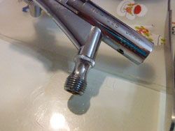 本体に差し込みます。恐ろしく、やりこい金属(プラチナ合金)なもんで、レンチでしめずに、ノズルマウンティングドライバーでキュッとしめて終わりにします。このノズルはエアブラシで一番取り付けに神経を使うところです。ノズルマウンティングドライバーがないと指で締めることとなりますが、ひょっとすべったら、マメ部品なのでどこいったか分からなくなることがあったり、真っ直ぐ入れたつもりが、なんせ指でノズルがよく見えませんからナナメに入っていてねじ山なめたなんてトラブルになりますが、専用工具があれば一撃で真っ直ぐ入れることが出来ます。自力OHマンには必須アイテムな特殊工具です。全部トータルTで仕入れてきました。