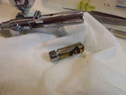 ですが、リールシートやリールといった超小物のウレタン塗装に、墨汁を使ったエアブラシアートの練習に、酷使しているので、OHでもしてみようかなと思って挑戦。なんせ、ぼっけぇたけエアブラシなもんで、キンチョーしますです!