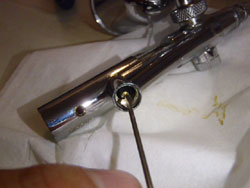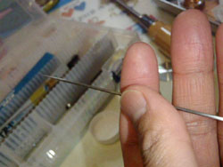 エアバルブピンOリングを外します。ニードルの先で内側にキズをつけないように外します。