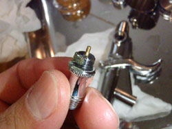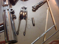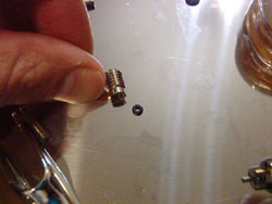 ローラーが外れたので、続いてエアバルブのピストンが外せます。ニードルのケツで押し外します。