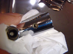 緩めて取ります。が、レンチがなかなか入らず、また、ノズルの締め付けも硬くて、なめてしまいました(汗)。レンチは必ず奥までちゃんと入れないといけませんな。とはいえ、なめたのは、レンチの入る外側です。本来ならその時点で新しいノズルと交換したほうがいいのですが、ワタシの場合、おそらく、その微妙な誤差は気づかないくらいのウデなので問題なしとして、次行きます(汗)ちなみに、ノズルのねじ山についている赤いのは、レッドパテと呼ばれる液体シールです。ノズルはやりこすぎて強い締め付けをするとネジ山がなめるので、強く締めることが出来ず、それでいて、ペンキが出るのを防がなければならないので、溶剤に侵されないレッドパテと言われる液体パッキンを塗布しているというわけです。